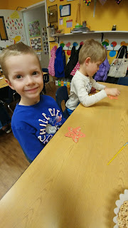 We also had a lot of fun with science this week! We loved a second visit from Mrs. Rose, this time to do a science experiment with us. See if your child can remember what makes a shark float in the water! We also did a fascinating "walking water" experiment to learn about primary and secondary colors as well as water absorption. See if your child can tell you about it! To go along with our conversations about the ocean levels, we looked at and discussed our very own "ocean in a jar" that our Bridge friends made for us! Finally, we made a class graph of our favorite ocean animals and compared these numbers.